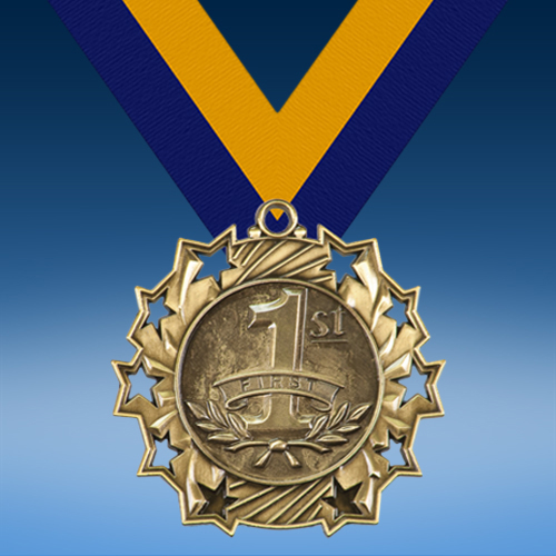 Award first place winners with our 1st Place Ten Star 3D Medal! This large gold finished medal award features a 3D “1st” with laurel branches within a 10-star border. Personalize the reverse side of this award with error-free engraving. Display this medal on the ribbon color of your choice for beautiful presentation. Perfect for recognizing first place achievements!