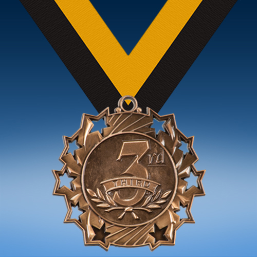 Award third place winners with our 3rd Place Ten Star 3D Medal! This large bronze finished medal award features a 3D “3rd” with laurel branches within a 10-star border. Personalize the reverse side of this award with error-free engraving. Display this medal on the ribbon color of your choice for beautiful presentation. Perfect for recognizing third place achievements!