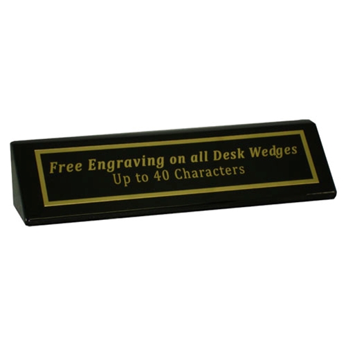 Classy looking black piano finished desk wedge with black and gold metal plate.