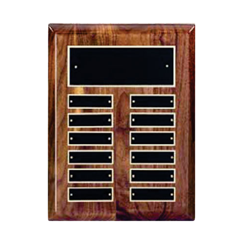 This Perpetual Plaque has a high gloss piano finish with solid American walnut and 12 solid brass engraving plates.