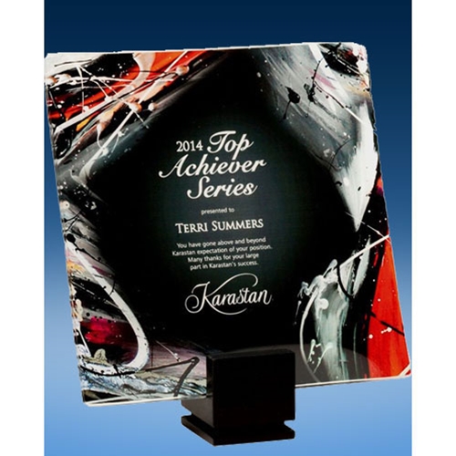 Recognize prestigious accomplishments with our Abstract Red Glass Tray award. This free-standing glass award features a modern design of bright red, white, black, and hints of yellow that are gracefully splattered along the border of the award. Personalize the center of this award with our error-free engraving. Elegantly raised on a freestanding dark black base, this glass award celebrates excellence in its class.