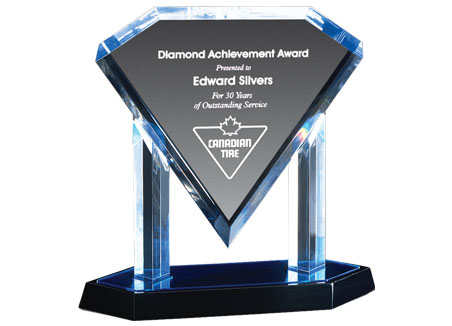 The Acrylic Floating Diamond Awards are impressive awards, crafted from polished acrylic, has a beveled diamond cut acrylic which rests freely on reflective posts. Light is reflected handsomely as it strikes the inset blue or gold mirrored base. The Acrylic Floating Diamond Award will engrave a crisp white color for excellent contrast. Your inscription or artwork will look astonishing on this award. These elegant awards are offered in three different sizes. *Acrylics were photographed using a black background to better show engraving detail.* **Visual proof will be supplied via email within 1-2 business days. Approval is required for order to be completed.**