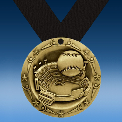 Celebrate accomplishments in baseball with our impressive Baseball World Class Medallion! This medal award features a baseball flying out of a stadium surrounded by stylized border. Available in either gold, silver, or bronze finishes. Personalize the reverse side of this award with error-free engraving. Display this medal on the ribbon color of your choice for beautiful presentation. This award is perfect for recognizing winners or participation in any baseball game, tournament, or event!