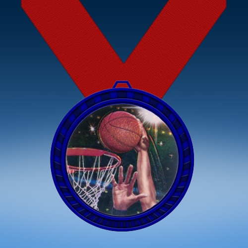 Congratulate the hard work of basketball players with our Basketball 2 Blue Colored Insert Medal! This medal award features a hand securely dunking a basketball into the basketball net. A blue stylized border encloses this design. Personalize this award with error-free engraving. Display this medal on the ribbon color of your choice for beautiful presentation. A perfect award to celebrate winning basketball performance!