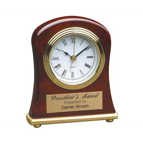 The Bell Shaped Desk Clock measures 4 ½” x 5”. It has a polished Piano Finish and includes AA batteries. Include your custom engraving on the next page.