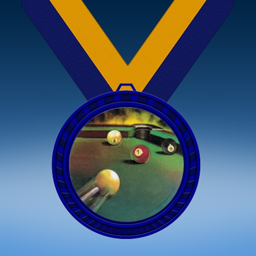 Celebrate talented billiard players with our Billiards Blue Colored Insert Medal! This medal award features a pool stick striking a cue ball towards other balls on a pool table. A blue stylized border encloses this design. Personalize this award with error-free engraving. Display this medal on the ribbon color of your choice for beautiful presentation. A perfect award to celebrate winning a billiard competition or tournament!