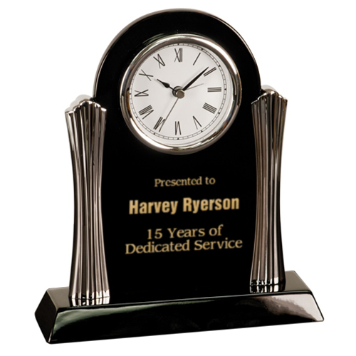 The Desk Clock with Metal Columns measure 8 1/4” x 7 1/2”. It has a polished Piano Finish and includes AA batteries. Include your custom engraving on the next page.