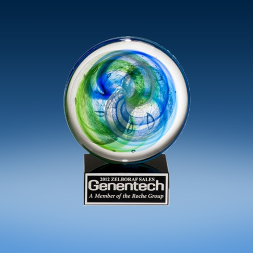 Art Glass Round Disc with Blue Green Accents on a Black Glass Base comes with an engravable aluminum plate for recognition. Stands 5 3/4″ x 7 1/4″