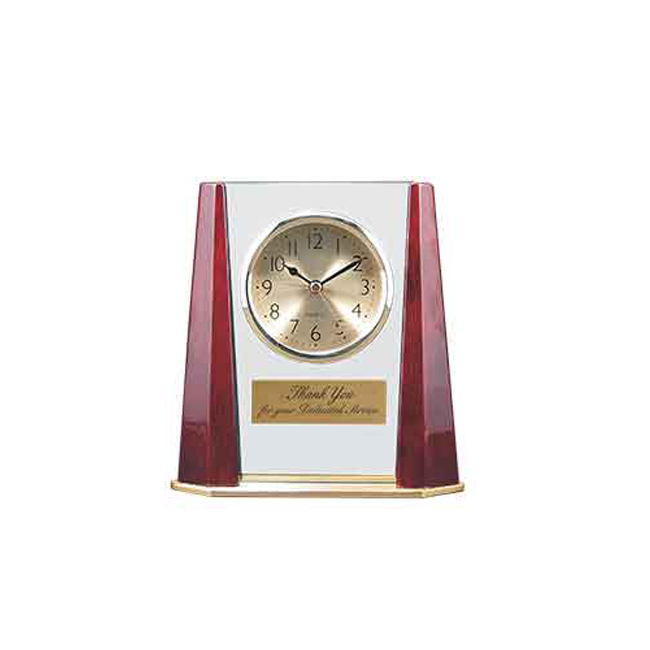 The Clock with Bevel Columns measures 6” x 6 ¾”. The face of the clock is 3 ½” in diameter. The glass pane in encased by Piano Finished columns and includes AA batteries. Include your custom engraving on the next page.