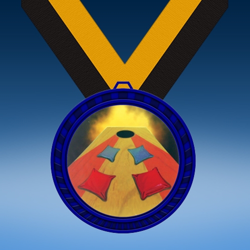 Aim to win with our Cornhole Blue Colored Insert Medal! This medal award features a cornhole board with 4 cornhole bean bags surrounded by the medal’s blue stylized border. Personalize this award with error-free engraving. Display this medal on the ribbon color of your choice for beautiful presentation. A perfect award for the winning champion of any cornhole game or tournament!
