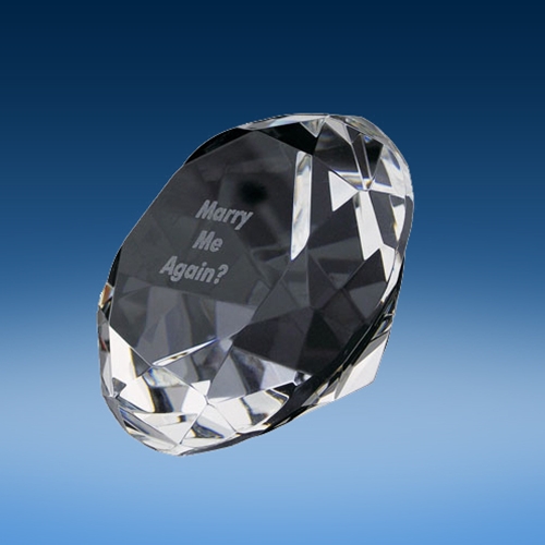 The Crystal Diamond Paperweight measures 3” x 3” x 2”. You can add free engraving or upload your logo. Enter your free engraving on the next page.