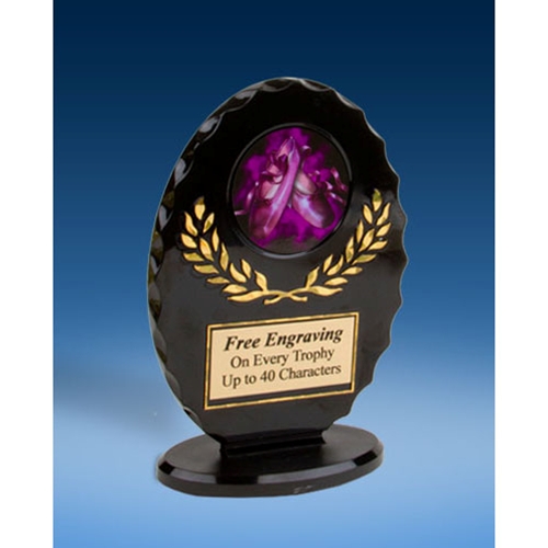 This nice 5” tall black acrylic oval accepts a 2” graphic decal of your sport/activity. It is also available in a 6” tall version.