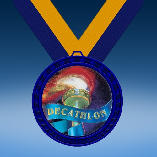 Honor the hard work of decathlon athletes with our Decathalon Blue Colored Insert Medal! This medal award features a flaming torch with a waving “DECATHLON” banner surrounded by the medal’s blue stylized border. Personalize this award with error-free engraving. Display this medal on the ribbon color of your choice for beautiful presentation. A perfect decathlon award!