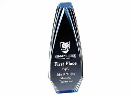 Our Diamond Obelisk Acrylic Award with its highly polished, smooth angles and detailed bevels make it ideal for any special event or professional dedication. These acrylics are accurately cut and finished in blue and gold. When lasered, the effect is a beautiful frost showing through the acrylic. Your inscription or artwork will look astonishing on this award. These elegant awards are offered in three different sizes.