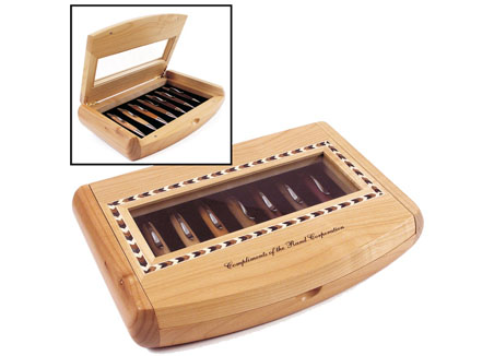 The Executive Pen Set is made from solid maple with inlaid trim and includes 7 wooden pens. Measures 10 5/8” x 7 5/16” x 1 ¾”. Include your FREE custom engraving on the next page.