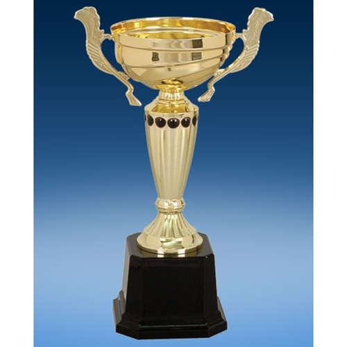 Award excellence with our Gold Black Dot Cup award! This trophy features a gold-plated metal cup with stylized wing handles elevated on a gold plastic stem riser. This award is showcased on a weighted base that can be personalized with error-free engraving. Honor your team’s best, top salesman or woman, or brightest student with this beautiful award!