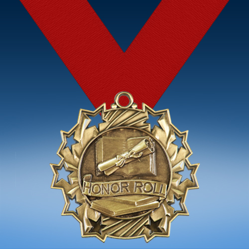 Celebrate academic excellence with our Honor Roll Ten Star 3D Medal! This large medal award features 3D imagery of an honor roll and a book within a 10-star border. Available in gold, silver, or bronze finishes. Personalize the reverse side of this award with error-free engraving. Display this medal on the ribbon color of your choice for beautiful presentation. Perfect for recognizing students who achieved the honor roll!