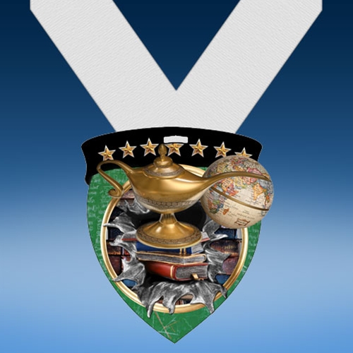 Celebrate academic accomplishments with our captivating Lamp of Knowledge Full Color Burst Medallions! This striking medal award features the Lamp of Knowledge on a stack of books and a globe bursting through the center of the award, giving this medal stunning visual dimension. The front side of this shield-shape award comes with a protective epoxy coating, while the reverse side can be personalized with error-free engraving. Display this medal on the ribbon color of your choice for beautiful presentation. This eye-catching award is perfect for recognizing winners or participation in any academic tournament or event!