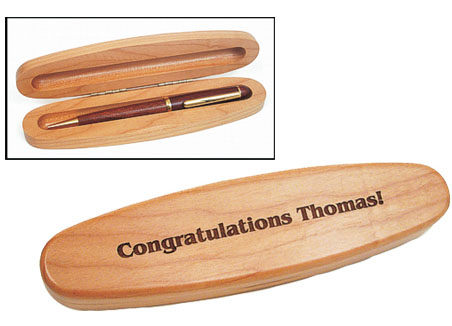 The Maple Single Oval Pen Box is made from solid maple and measures 6 ¾” x 1 ¾” x 7/8”. Include your FREE custom engraving on the next page.
