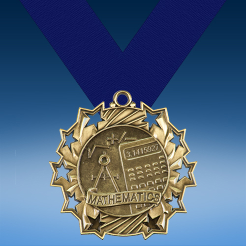 Celebrate achievements in mathematics with our Math Ten Star 3D Medal! This large medal award features 3D imagery of math symbols, a compass, and a calculator within a 10-star border. Available in gold, silver, or bronze finishes. Personalize the reverse side of this award with error-free engraving. Display this medal on the ribbon color of your choice for beautiful presentation. Perfect for recognizing a variety of achievements in math!