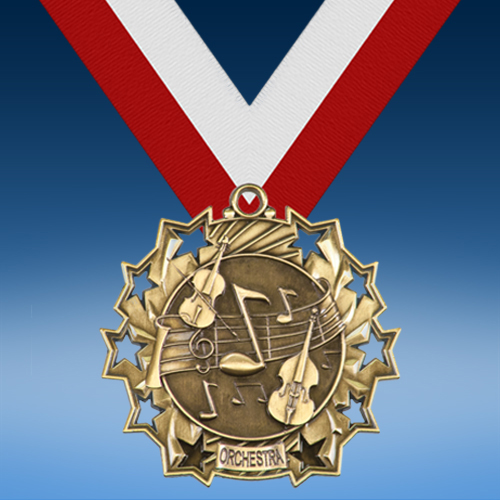 Celebrate achievements in orchestra with our Orchestra Ten Star 3D Medal! This large medal award features 3D imagery of a violin, cello, and musical notes within a 10-star border. Available in gold, silver, or bronze finishes. Personalize the reverse side of this award with error-free engraving. Display this medal on the ribbon color of your choice for beautiful presentation. Perfect for recognizing a variety of achievements in orchestra!