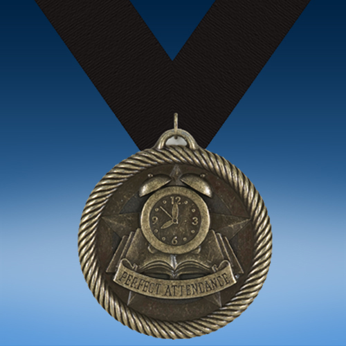 Celebrate excellent attendance with our classic Perfect Attendance Academic Wrapped Medal! This 3-D medal award features a banner that read “PERFECT ATTENDANCE” in front of a clock sitting on an open book surrounded by a rope border. Personalize the reverse side of this award with error-free engraving. Display this medal on the ribbon color of your choice for beautiful presentation. A stunning award to honor outstanding attendance for students and employees!