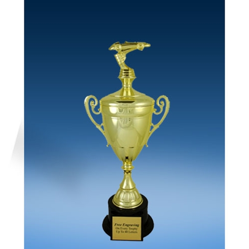 - Gold cup with figure and base measures approximately 17” tall
