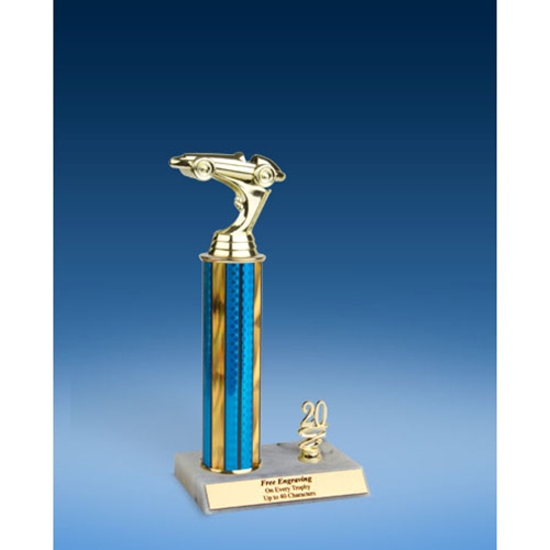 Racing sport figure and base measure 10” due to figurine height. Column height same as standard 12″ trophies.