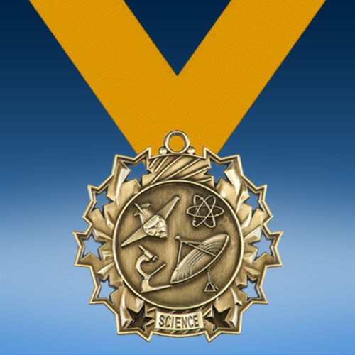 Award science champs with our Science Ten Star 3D Medal! This large medal award features 3D science imagery within a 10-star border. Available in gold, silver, or bronze finishes. Personalize the reverse side of this award with error-free engraving. Display this medal on the ribbon color of your choice for beautiful presentation. Perfect for recognizing achievements in science!