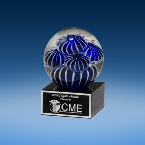 Beautiful Art Glass Globe with Blue and White Sean Anemone Design ists on a Black Glass Base with an engravable aluminum plate for recognition. Stands 3 1/2 x 5.