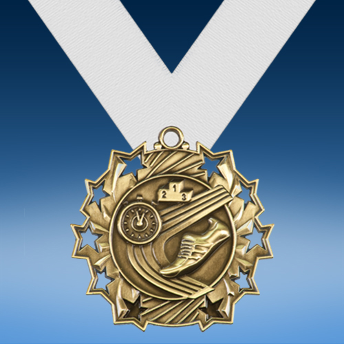 Award track champs with our Track Ten Star 3D Medal! This large medal award features 3D track imagery within a 10-star border. Available in gold, silver, or bronze finishes. Personalize the reverse side of this award with error-free engraving. Display this medal on the ribbon color of your choice for beautiful presentation. Perfect for recognizing achievements in track!