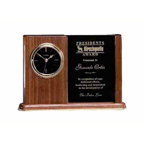 The Victory Contemporary Clock measures 8” x 5 ¼” x 1 ½”. The wood is a high gloss walnut and includes frosted glass for etching your logo and message. Include your custom engraving on the next page. **Battery Not Included**