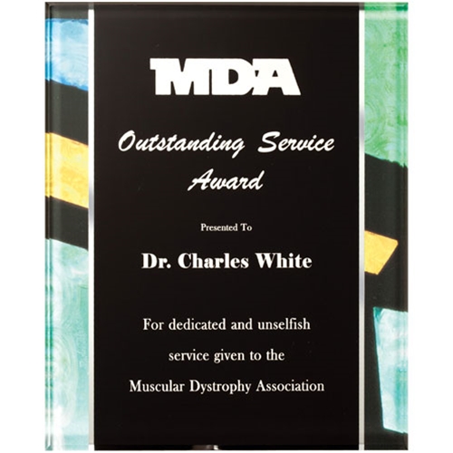 Recognize excellence with our Vogue Acrylic Plaque. This modern award features vertical borders of blues, greens, and yellows interspaced by thick black lines. The plaque’s black acrylic center can be personalized with our error-free engraving. Available in 2 different sizes and comes complete with a self-adhesive back hanger. A perfect modern award for any office or corporate space!