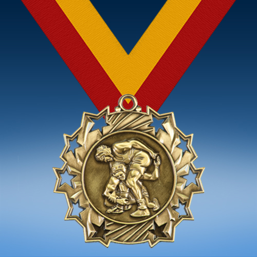 Award wrestling champs with our Wrestling Ten Star 3D Medal! This large medal award features 3D wrestling imagery within a 10-star border. Available in gold, silver, or bronze finishes. Personalize the reverse side of this award with error-free engraving. Display this medal on the ribbon color of your choice for beautiful presentation. Perfect for recognizing achievements in wrestling!